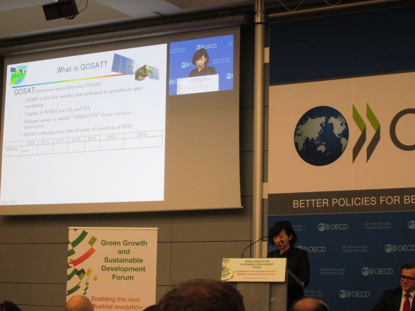 このフォーラムは、直前までパリで開催されていたCOP21で合意された「脱炭素社会」構築にむけての革新的技術の推進のための情報交換を行うもので、2日間にわたり、全体セッション3つとパラレルセッション3つによって構成されました。セッション3では、近年大量に得られる様々なデータがグリーン成長にどう貢献するかを討議しました。このセッションで林田教授は日本の貢献として温室効果ガス観測技術衛星「いぶき」(GOSAT)と地球環境情報統合のための統合・解析システム(DIAS)について紹介を行いました。討論では温室効果気体の発生が衛星からどの程度観測できるかなどについて質問がありました。