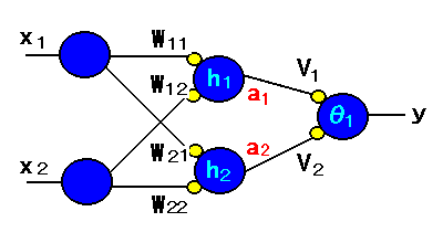 それでは、入力X1、X2に対して、 出力yを求めてみる。 中間層の結合荷重の添 字は、入力層の1番目のユニットから 中間層の1番目のユニットへの結合のとき はW11、 入力層2番目から中間層1番目の時はW12 というようについています。出力 層の結合荷重はV1、V2とし、 それぞれのユニットのしきい値はh1、h2 、θ1として います。また出力関数fは階段関数です。 まず、中間層での出力であるa1、 a2を求めてみる。