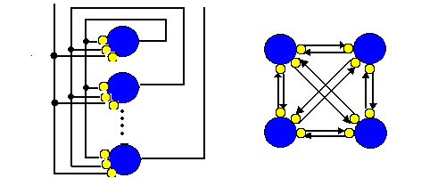 ホップフィールドネットワークは相互結合型ネットワークの代表的なものです。 1 980年代の前半にJohn Hopfieldという人が提案しました。 ネットワーク構成は次 の図のようになっています。(参考図:zu-hikai.gif)