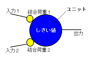 ユニットはしきい値演算をするためのものです。 入力に重みをかけた総和がし きい値を超えたか判定し、 超えれば「1」を出力、超えなければ「0」を出力しま す。