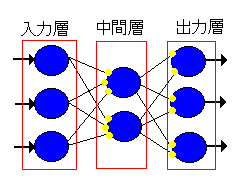 中間層の結合荷重が学習によって変更できる。 学習法はバックプロパゲーションを用いる。 出力関数はシグモイド関数を使う。 出力値は0から1の実数値である。 バックプロパゲーションという学習法(参考図:zu-back2.gif)